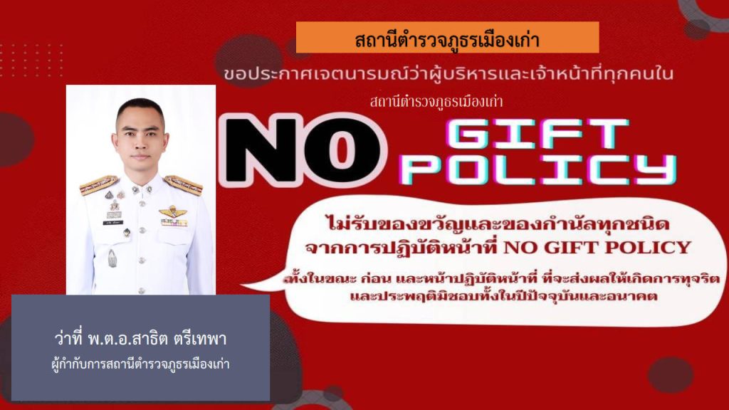 สภ.เมืองเก่า ขอ แสดงอินโฟกราฟิก นโยบาย ไม่รับของขวัญและของกำนัลทุกชนิด (No Gift Policy) จากการปฏิบัติหน้าที่